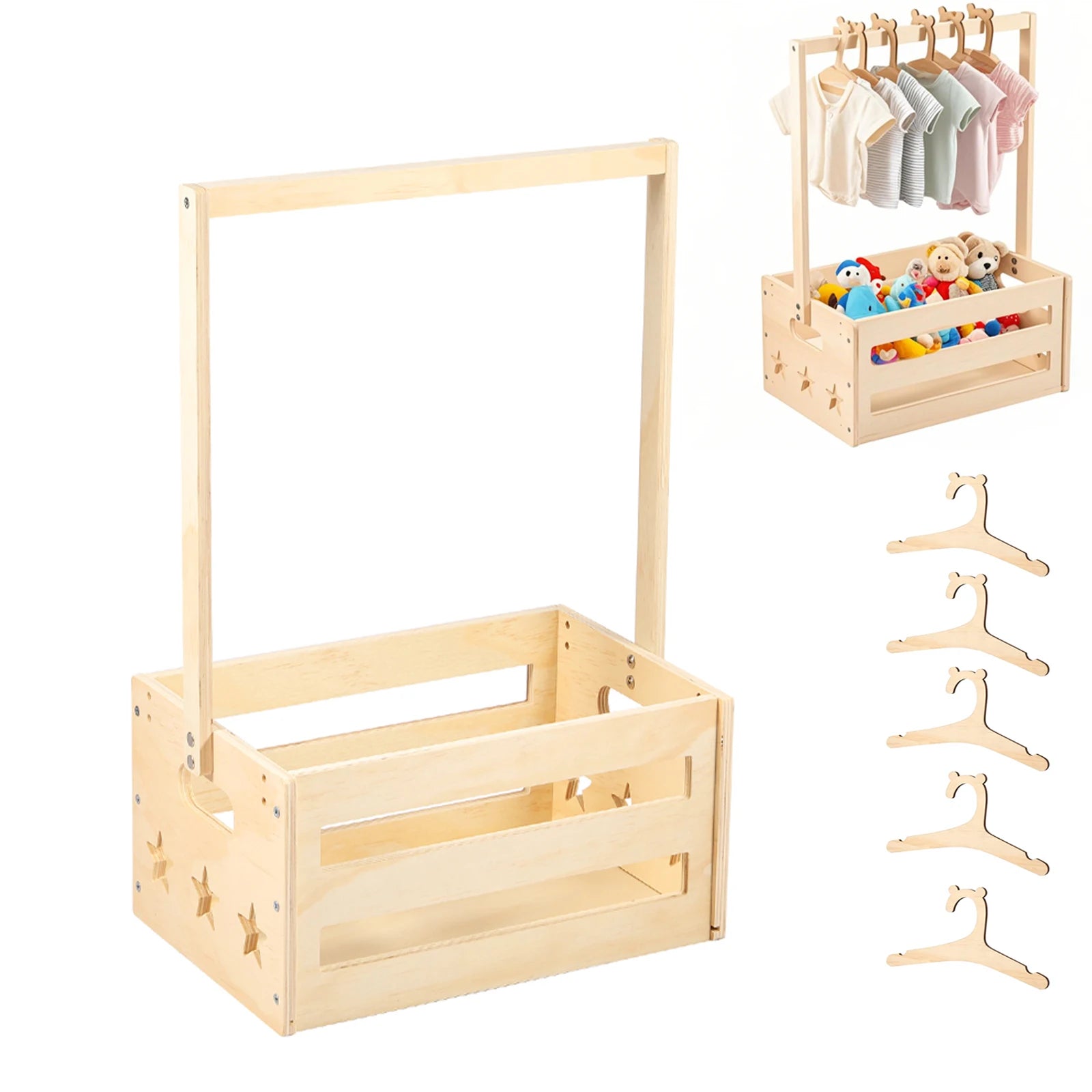 This wooden baby shower crate closet can be used for storage and hanging baby clothes or toys. It is made of wood material, which is sturdy and enduring. It is easy to assemble and suitable for storing baby necessities in the nursery.